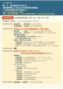 山口大学理学部地球圏システム科学科と工学部社会建設工学科の教育カリキュラムは、一般社団法人日本技術者教育認定機構(JABEE)の認定を受けており、国際的に通用する技術者教育を行ってきました。JABEE認定から20年を経過し、これまでの技術者教育の取組みを振り返るとともに、大学の技術者教育について卒業生、留学生、各界からご意見を伺います。さらに、一般社団法人日本医学教育評価機構(JACME)の認定を受けている医学部医学科を交え、教育の分野別質保証についてパネルディスカッションで議論を深めます。